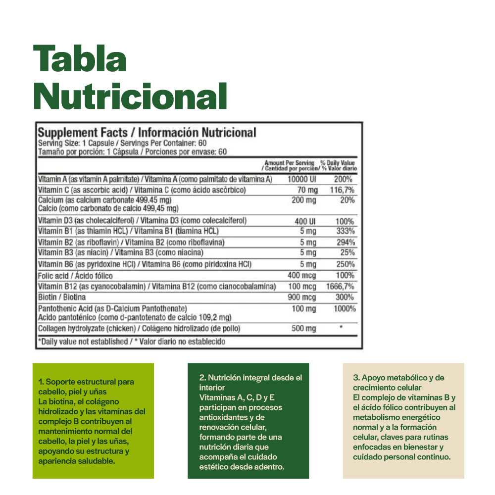 Un suplemento diseñado para acompañar el cuidado diario del cabello desde el interior, integrando micronutrientes que participan en procesos fisiológicos relacionados con la salud capilar. Ideal para quienes buscan mantener una rutina de bienestar consciente y constante.